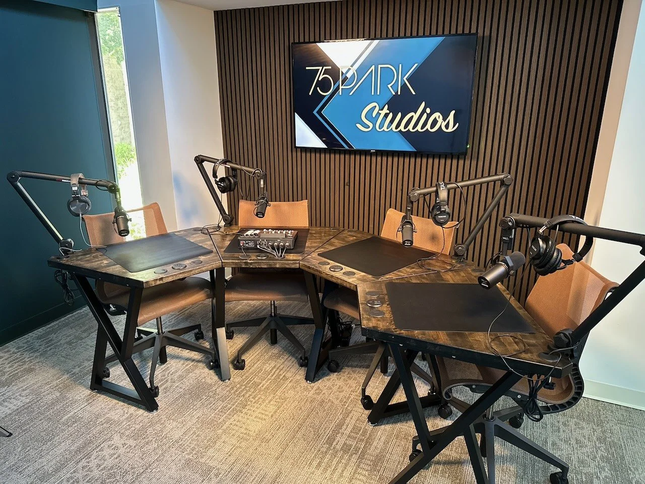 The Podcasting side has 4 desks with microphones, branding backdrop and video synchronization for those that want to do a video podcast. Just bring a USB stick and your idea! -